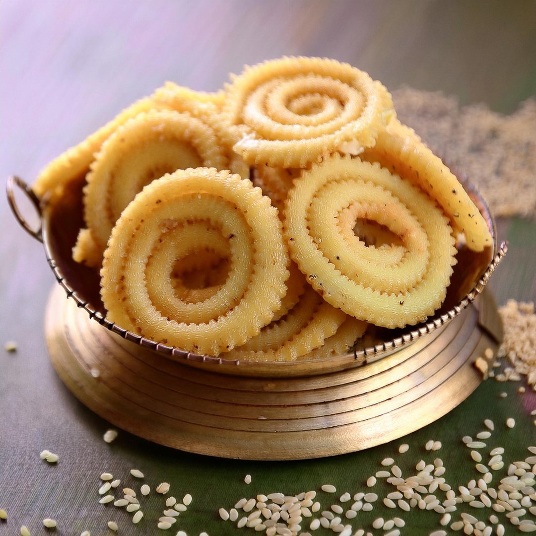 Murukku is a popular South Indian crispy snack made from rice flour and urad dal (black gram) flour, often flavored with cumin, sesame seeds, or chili. The dough is shaped into spirals or coils using a special press and then deep-fried until golden brown. It has a crunchy texture and is commonly enjoyed during festivals like Diwali or as an everyday tea-time snack.